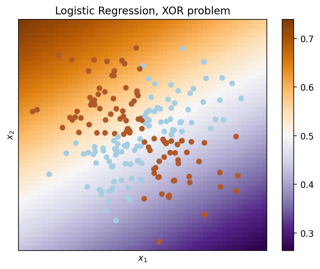 LogisticRegression(solver="lbfgs"), X, y, "Logistic Regression, XOR problem"